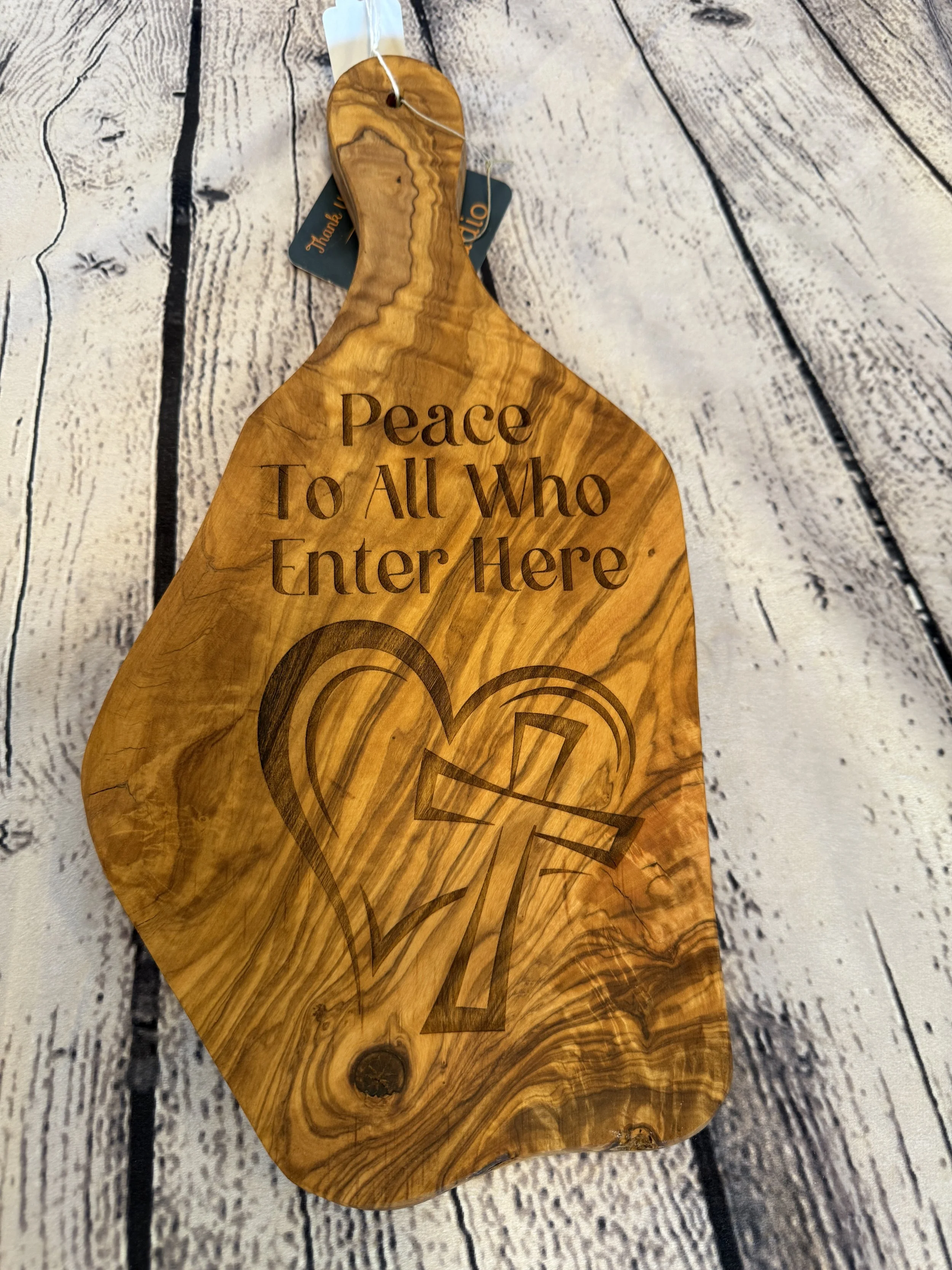 Laser engraved “He calms the Storm” with Cross on olive wood board, hangable for decoration.