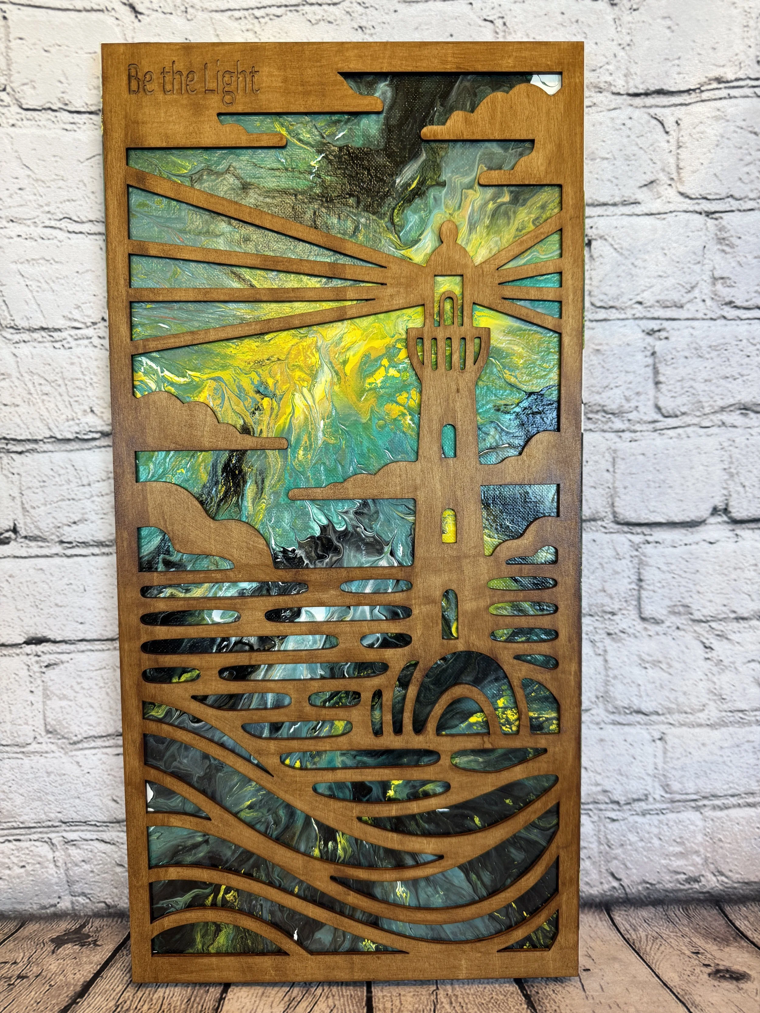 The wood laser cut design is painted blue with gold light shining from the lighthouse, white clouds and the phrase “Be the Light” engraved in the corner and highlighted in gold.