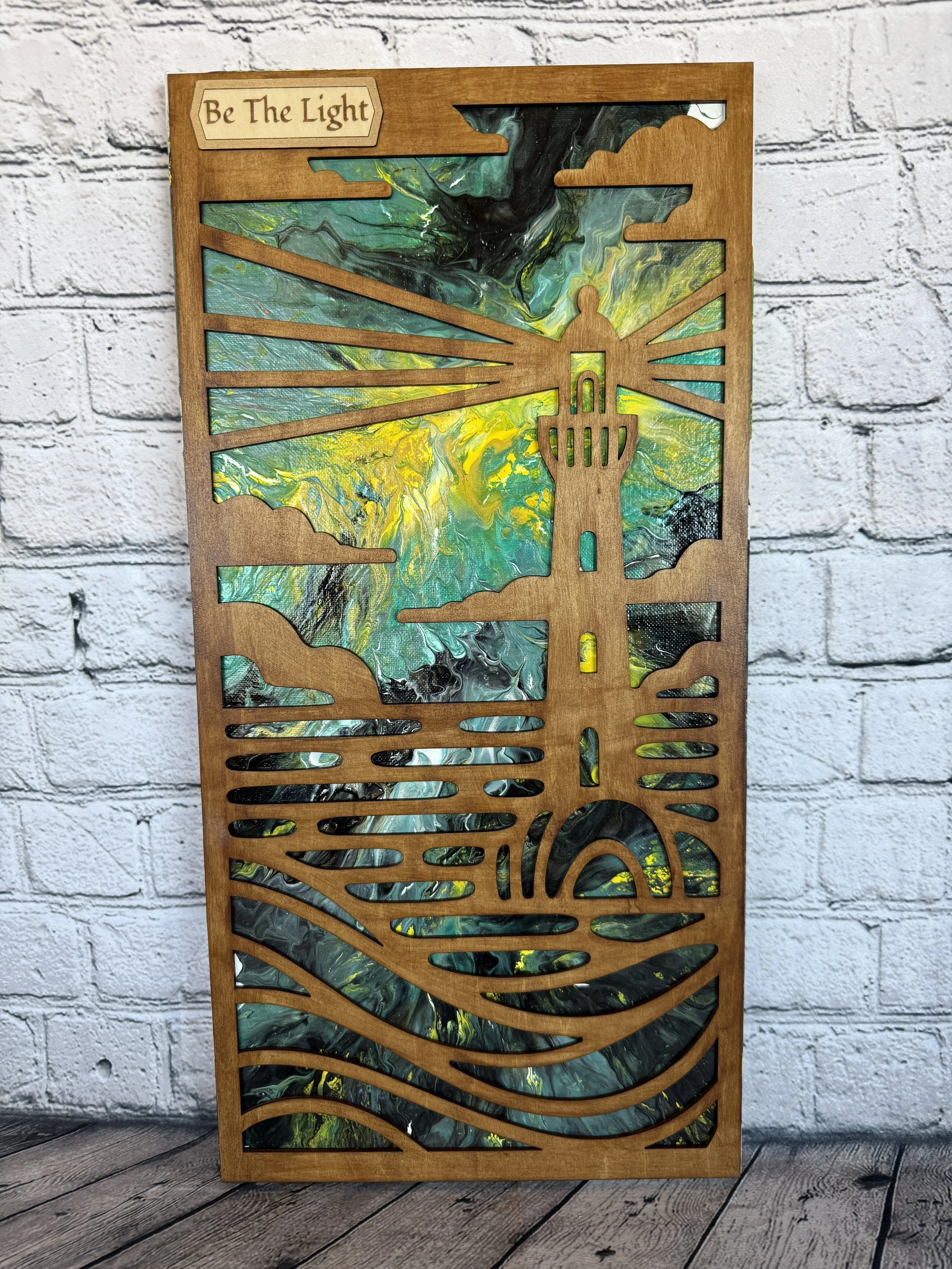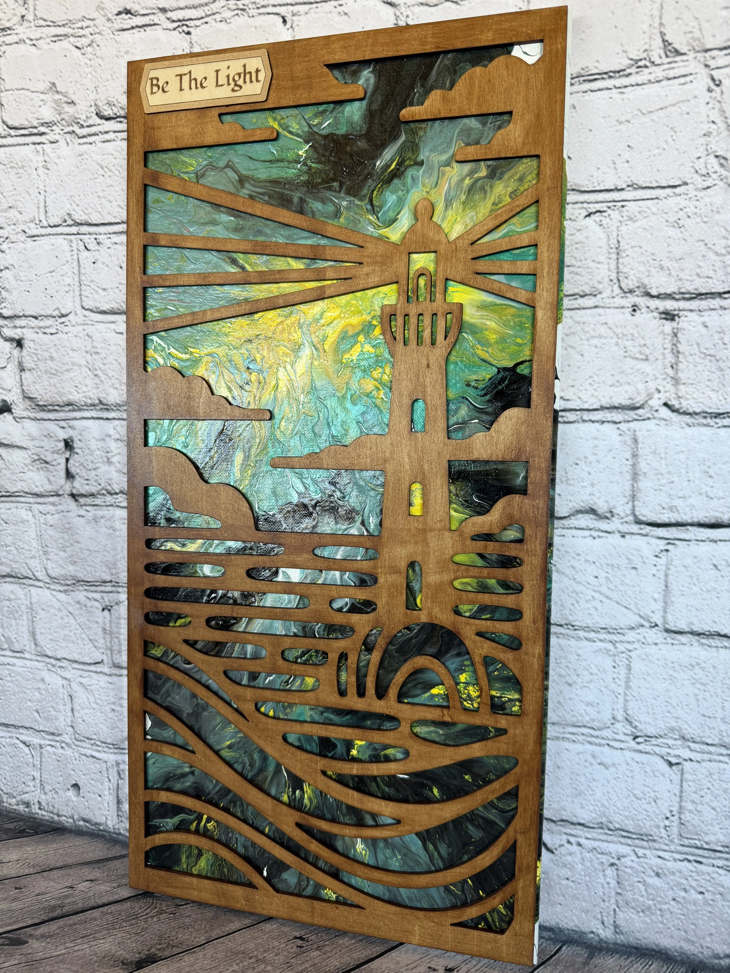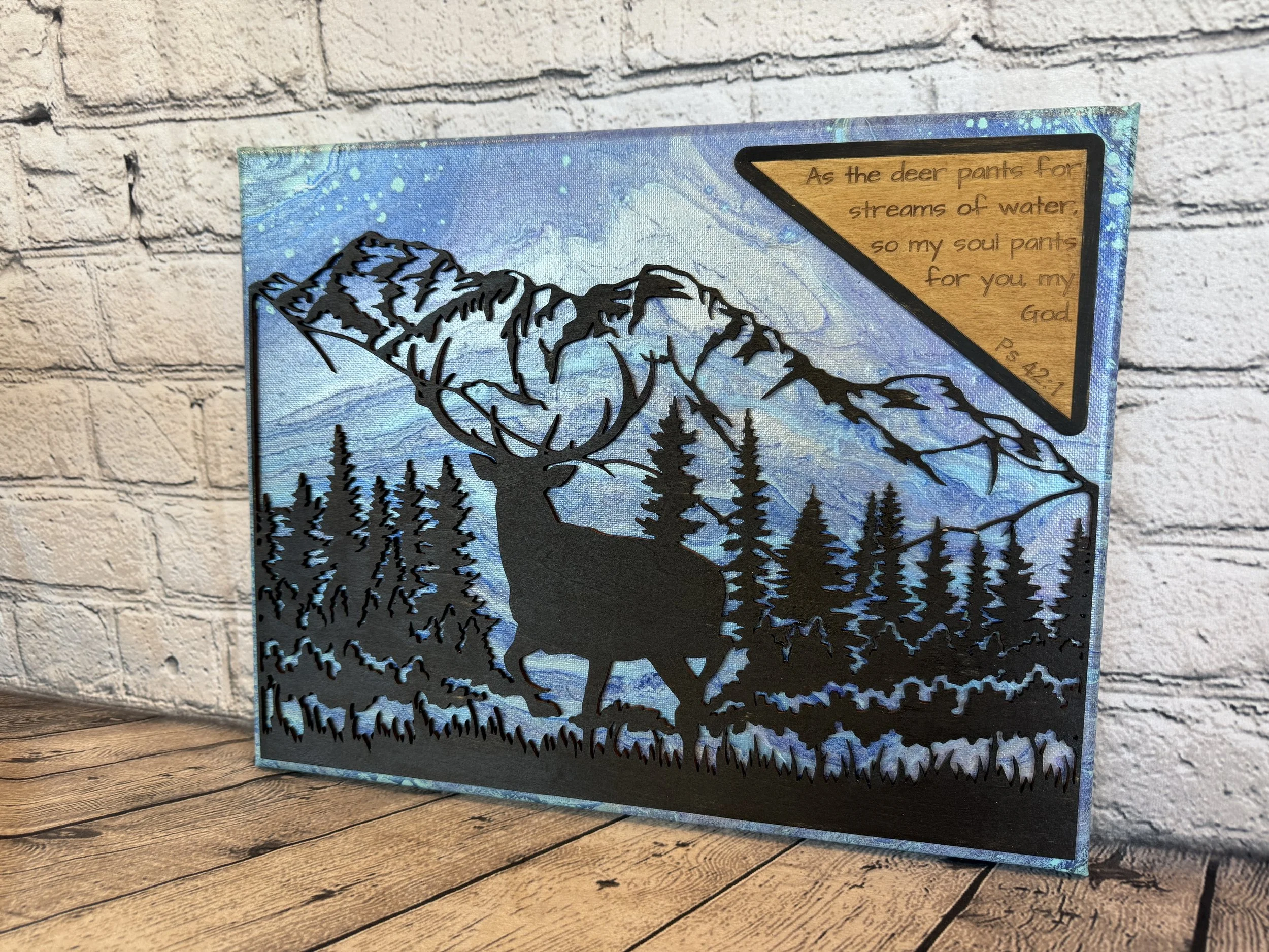 Wood laser cut silhouette of a cowboy figure overlayed on an original fluid art painting. The cowboy is engraved, and the details his clothing are slightly visible under the black stain.