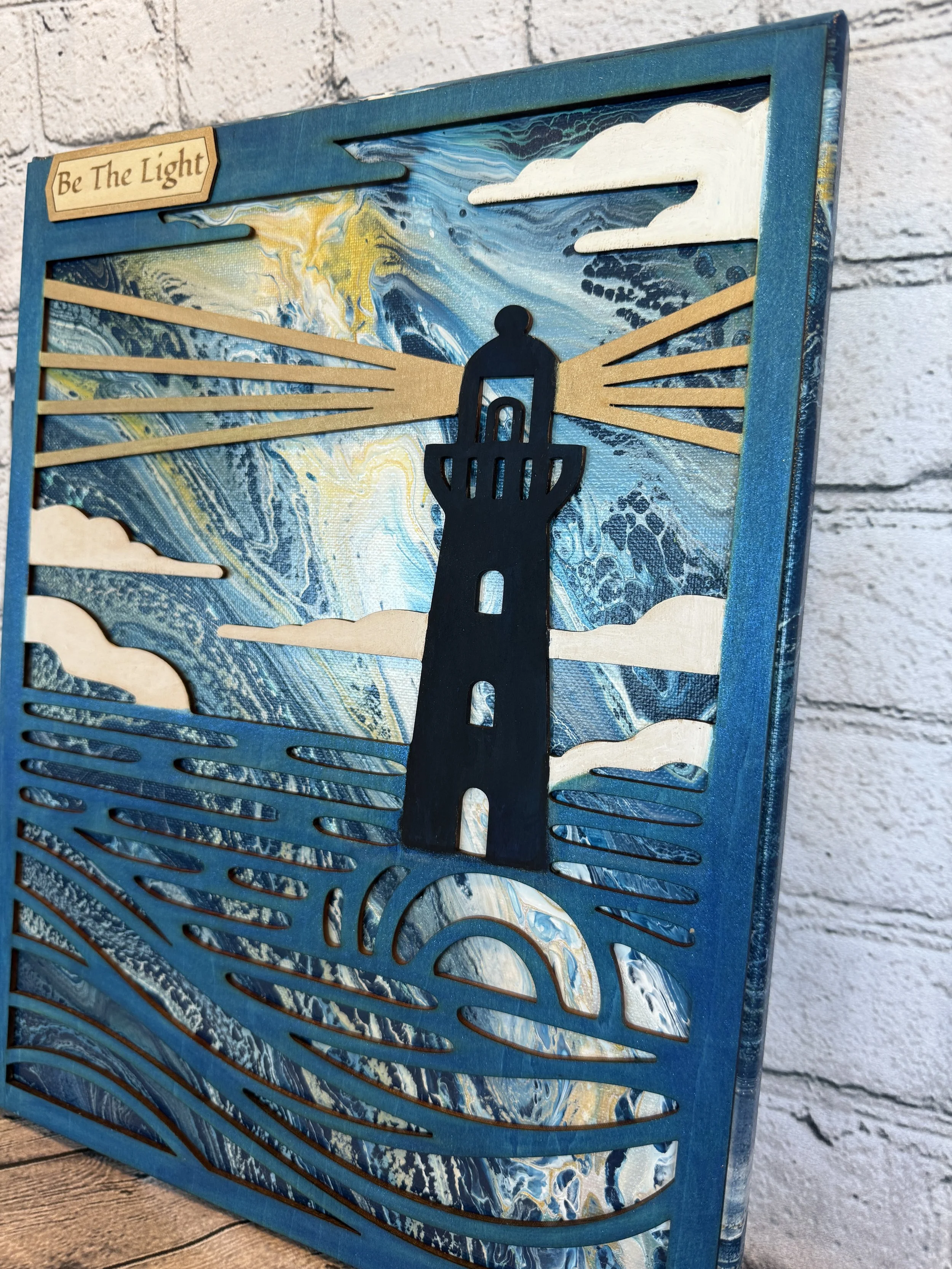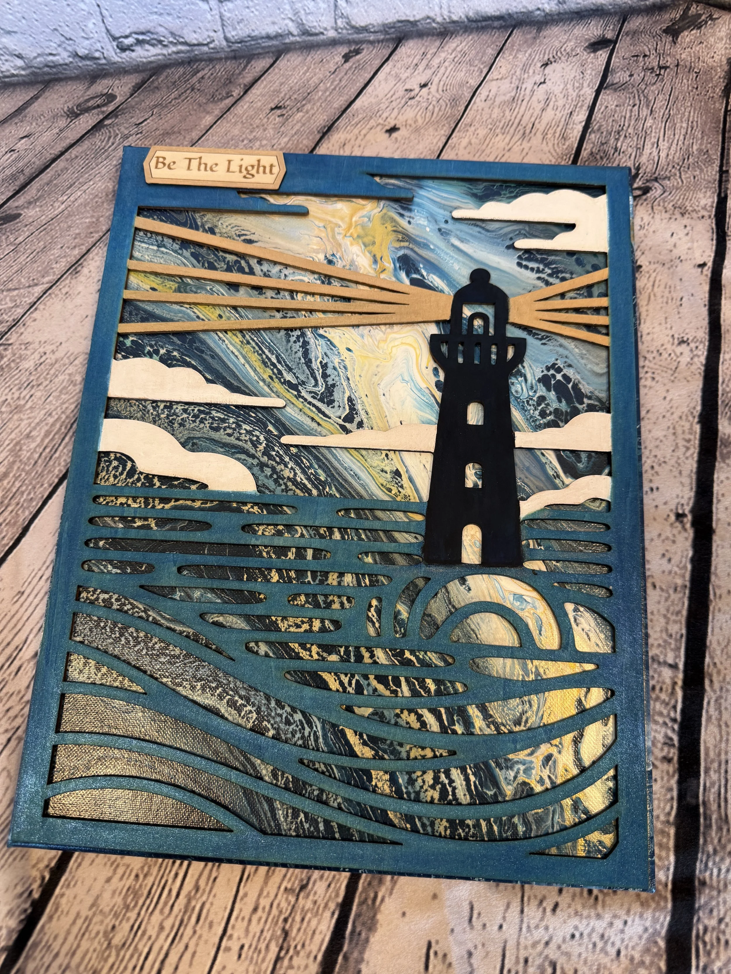 The wood overlay is stained brown on a fluid art painting that has a variety of colors swiping across the canvas some copper, maroon, gold, and teal.