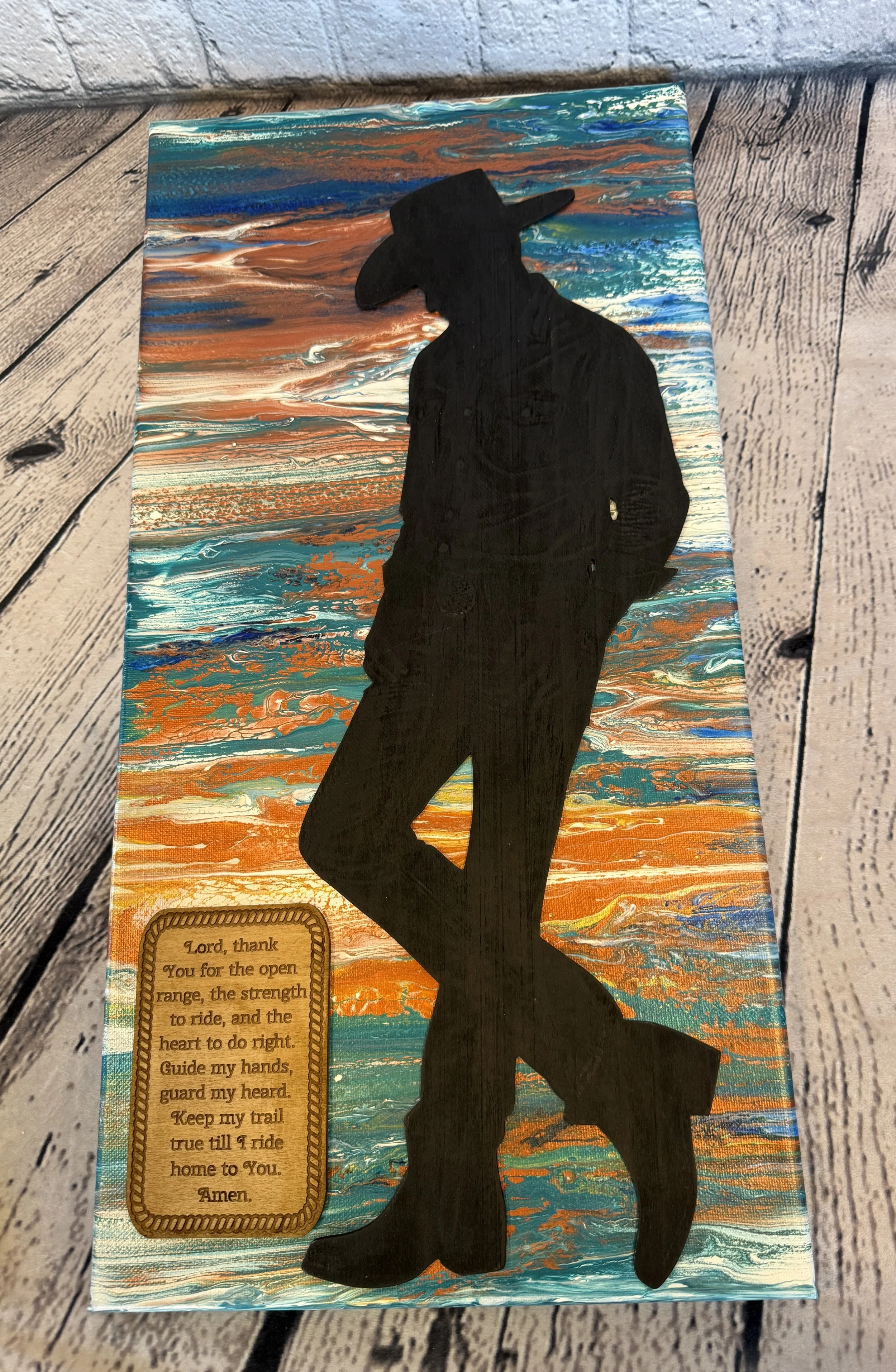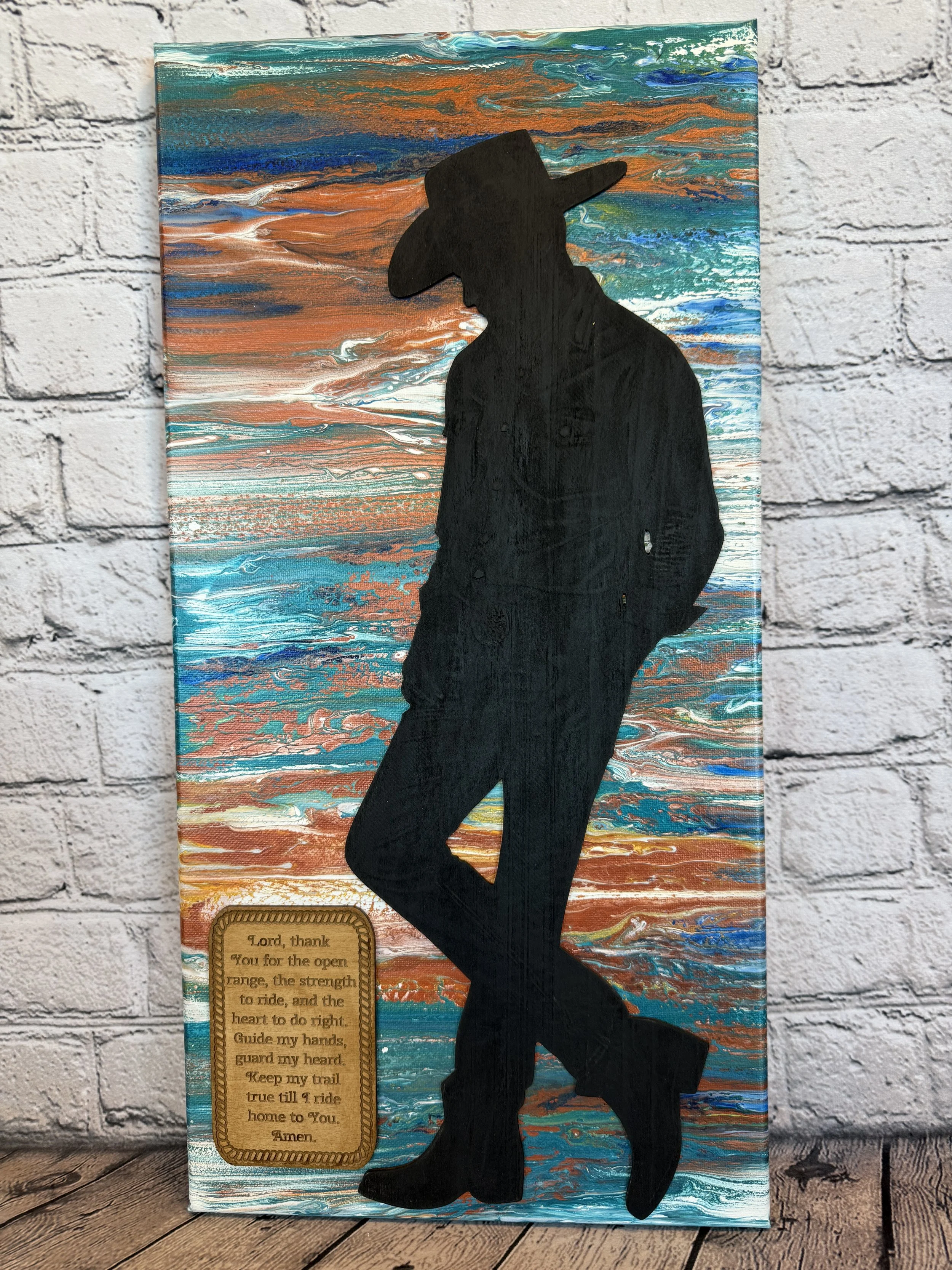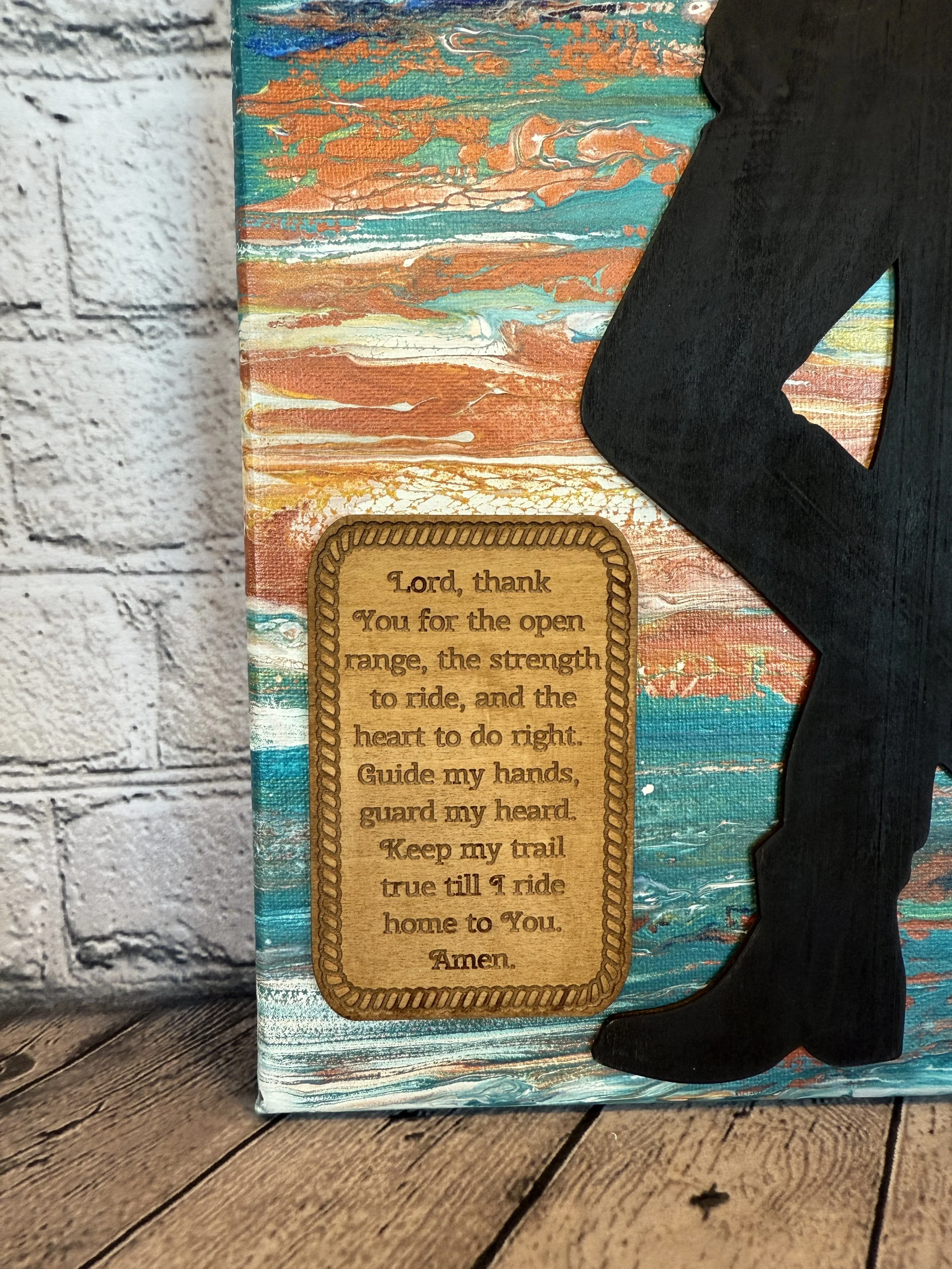 This home blessing “Be blessed when you come in and blessed when you go out.” Lord, bless this home continually. Amen” Deut. 28:6 is engraved on the bottom of the cross. The cross is laser cut and engraved from wood and placed on an original fluid art painting in blues, green and gold.